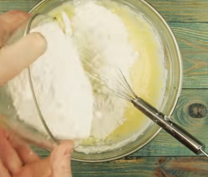 Do miski wbij dwa jajka, dodaj szklankę cukru i ubijaj za pomocą trzepaczki. Do mieszanki dodaj ulubiony dżem, kefir, mąkę oraz sodę. Całość dokładnie mieszaj aż do uzyskania lejącej się masy.