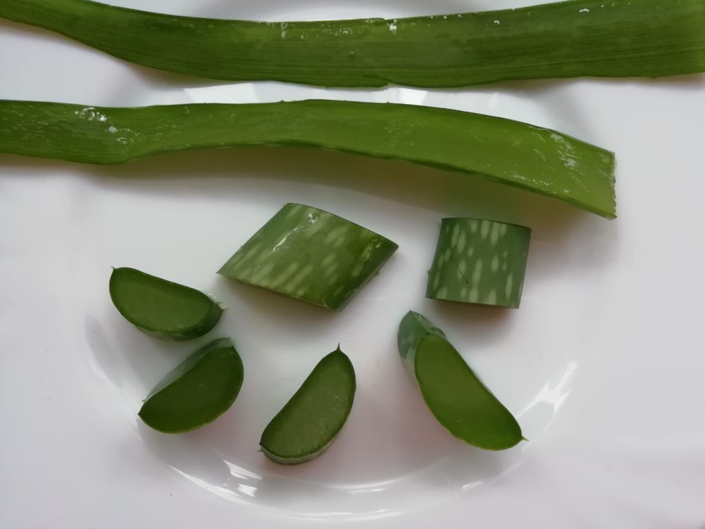 Teraz obierz liść aloesu, aby uzyskać miąższ. Ma właściwości przeciwzapalne, przeciwbakteryjne i lecznicze. Umieść miąższ w misce.
