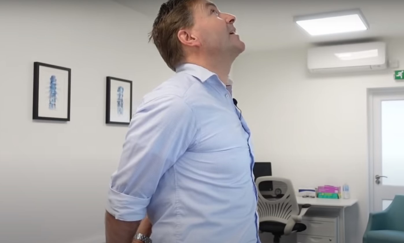 Stań blisko ściany, połóż prawą rękę na ścianie jak najwyżej, odwróć głowę w prawo i pochyl się w bok. Wytrzymaj w tej pozycji około 15 sekund i powtórz ćwiczenie 3 razy na każdą stronę ciała.