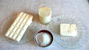 Na małym ogniu rozpuść masło i czekoladę. Dobrze wymieszać. Wymieszaj z mlekiem skondensowanym, a następnie dodaj wiórki kokosowe. Dobrze połącz wszystkie składniki.
