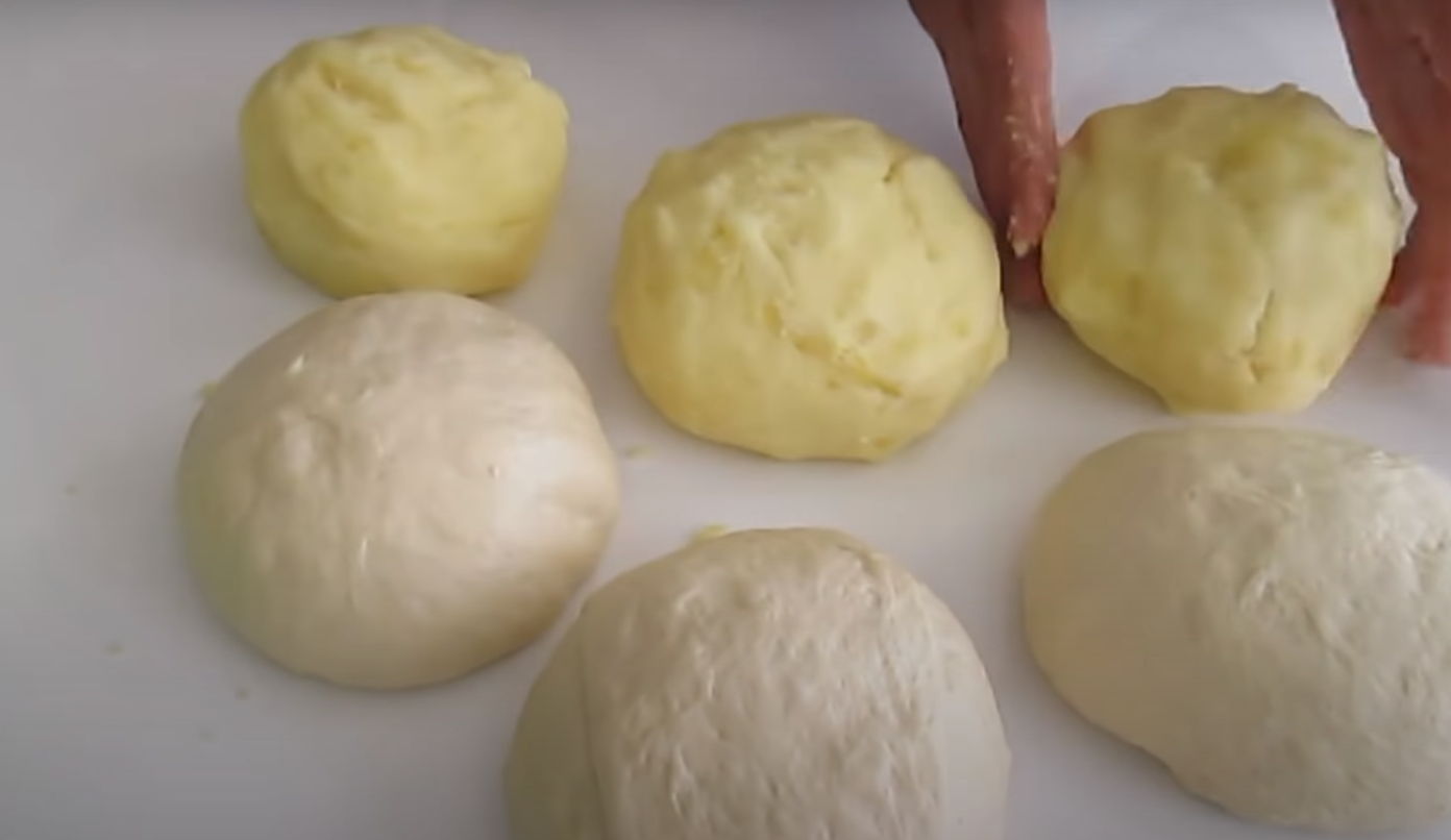Ziemniaki obrać, pokroić na mniejsze kawałki i ugotować do miękkości. Następnie rozgniatamy je na miąższ, dodajemy trochę mleka, startego sera, sól do smaku i dobrze mieszamy. W międzyczasie wyrośnięte ciasto przełożyć na blat, podzielić na 3 części i rozwałkować. Z nadzienia ziemniaczanego uformujemy również 3 kulki tej samej wielkości, które wykorzystamy do nadzienia.