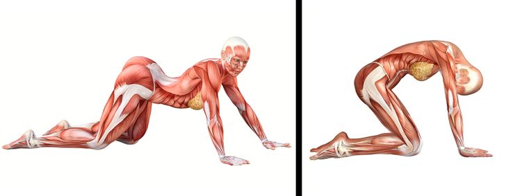 Grzbiet kota świetnie rozgrzewa kręgosłup, kark i ramiona. Padnij na ręce i kolana. Powoli zegnij plecy, połóż się na brzuchu na ziemi i podnieś głowę. Przytrzymaj przez kilka sekund. Powoli wygnij kręgosłup w górę jak kot. Powtórz 10 razy.