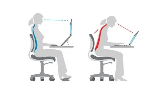 Jeśli pracujesz na komputerze, lokalizacja monitora odgrywa ważną rolę. Im niżej jest umieszczona, tym bardziej tył jest zaokrąglony. Dlatego powinien znajdować się na wysokości oczu i powinien być jak najbardziej wyśrodkowany. Równie ważna jest wysokość stołu, na którym znajduje się monitor i klawiatura. Łokcie powinny tworzyć kąt 90 stopni, a ramiona powinny być rozluźnione.