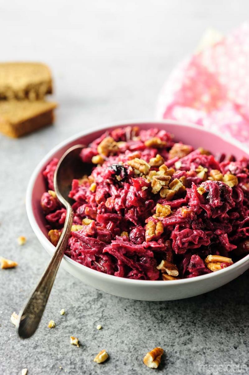 Jeśli śliwki są zbyt suche, możemy przez chwilę zalać je gorącą wodą. Pokrój buraki oraz śliwki, wymieszaj. Posyp orzechy na małe kawałki i dodaj do masy. Na koniec dodaj miód, jogurt i gotowe. Ta sałatka to jeden z najlepszych sposobów na delektowanie się czerwonymi burakami.