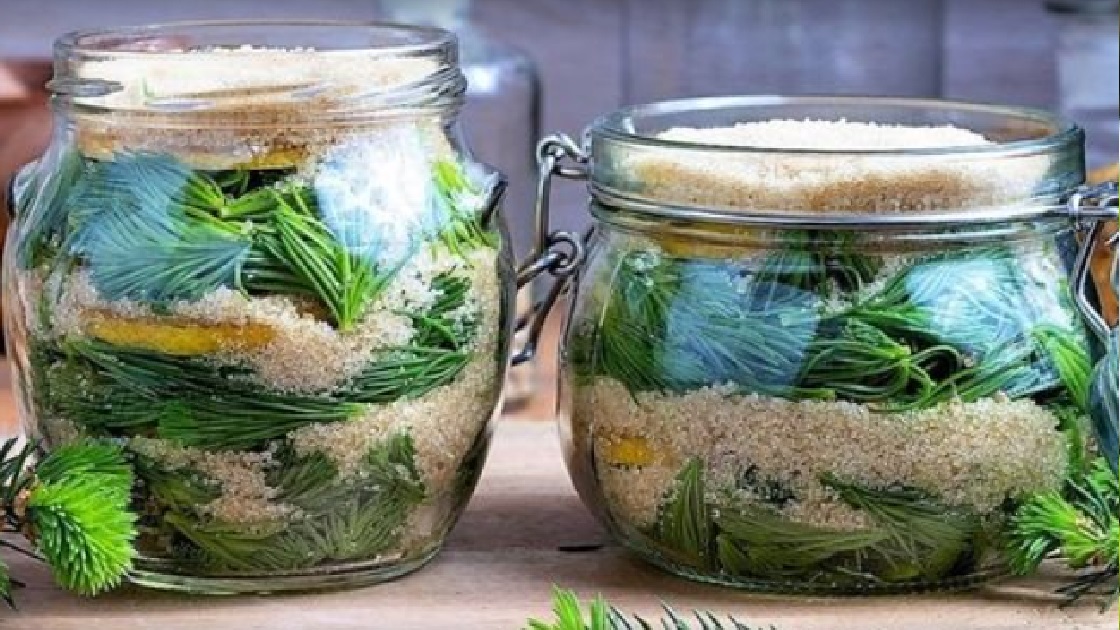 Opłucz pod wodą pędy świerka i pozwól im ociec. Do większego słoika na dżem ułóż warstwę pędów na ok. 3 cm, zasyp 1,5 cm warstwą cukru, ułóż na nim plasterki cytryny i powtarzaj procedurę, aż do napełnienia słoika (ostatnią warstwą powinien być cukier).