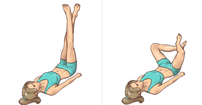 Pozycja wyjściowa: Leżąc na plecach, trzymaj nogi podniesione i skrzyżowane (prawą nogą umieść na lewej nodze). Obie nogi powinny być napięte i dociśnięte do siebie. Zegnij kolana w boki, a następnie powróć do początkowej pozycji.