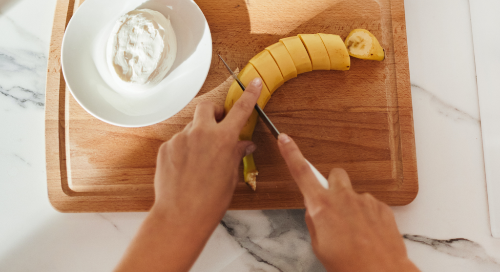 Cięcie każdego cięcia wycinamy pod kątem. Weźmy banana. Pokrój go razem ze skórką w średniej grubości krążki.