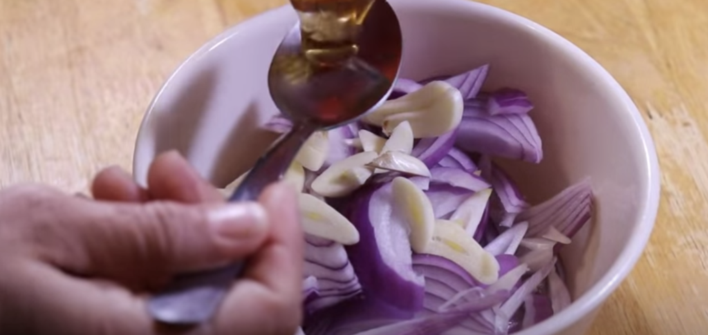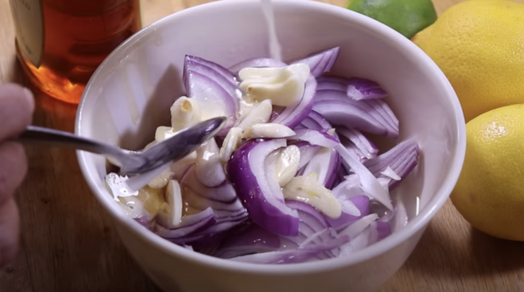 Połącz pokrojoną cebulę, czosnek, miód i sok z cytryny w miseczce i przykryj.