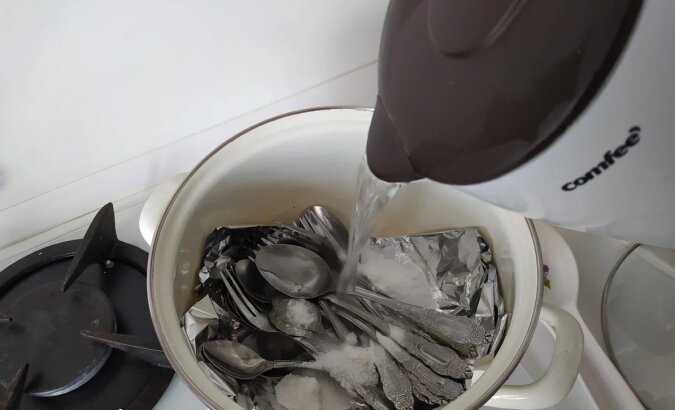 No i oczywiście sztućce – łyżki, widelce, noże. Jak czyścić łyżki i widelce wykonane ze stali nierdzewnej. Potrzebujemy świeżo ugotowanej wody (od 1 do 1,5 litra). Potrzebny jest głębokie naczynie. Dno garnka wyścielamy 1 warstwą folii, następnie kładziemy na niej nasze sztućce i wsypujemy po 1 łyżce soli i sody. Prawdę mówiąc nie mam pojęcia jaką rolę odgrywa folia w tej metodzie, ale bez niej ona nie działa.