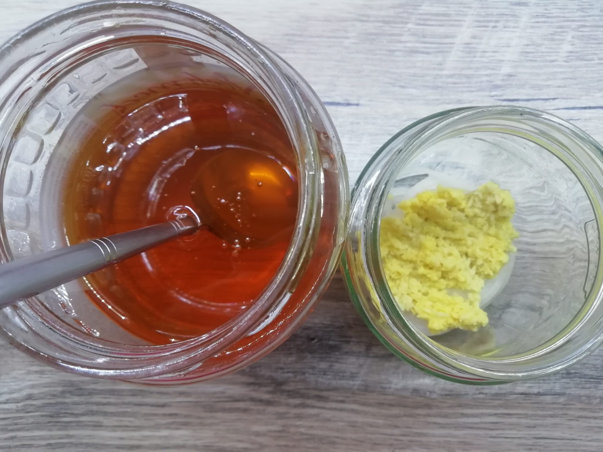 Do miski wrzuć 2 łyżki startego imbiru. Dodaj do niego łuskany i prasowany czosnek.