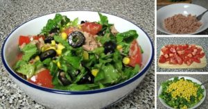 Liście sałaty należy umyć i osuszyć papierowym ręcznikiem. Umieść tuńczyka w misce i odsącz z nadmiaru płynu. Dodaj do tuńczyka pokrojone pomidory. Następnie dodać porwaną sałatę, a potem kukurydzę i oliwki. Na koniec pokroić paski z oliwek i oliwki. Doprawić solą i pieprzem, dodając kilka kropel oliwy z oliwek. Dobrze wymieszać i natychmiast podawać. Na wierzchu podawać z chlebem razowym.