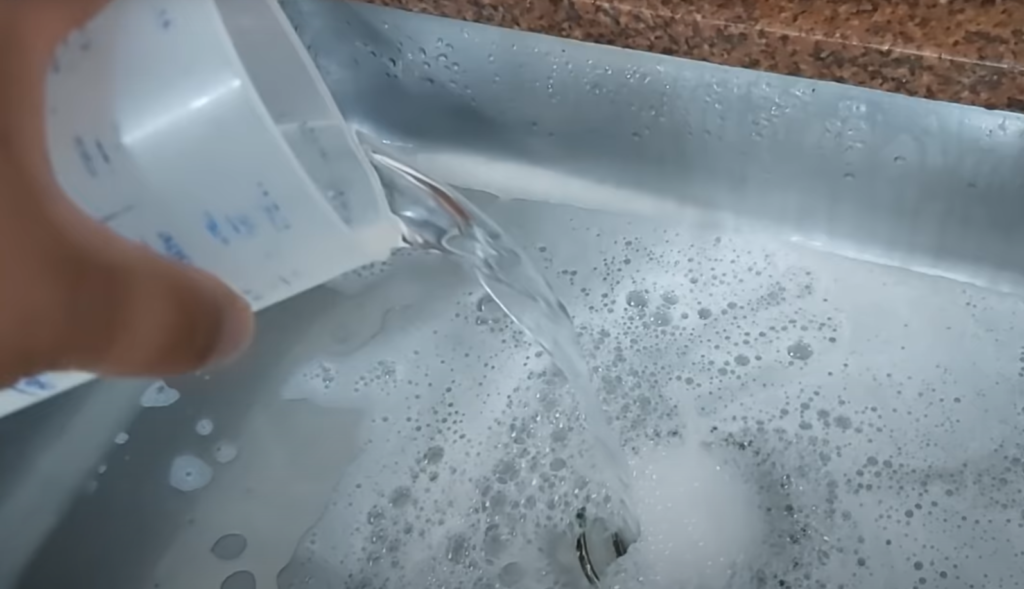 1. Wsyp proszek do prania do odpływu i zalej go wrzątkiem. Odpływ natychmiast zaczyna bulgotać i tworzy się piana.