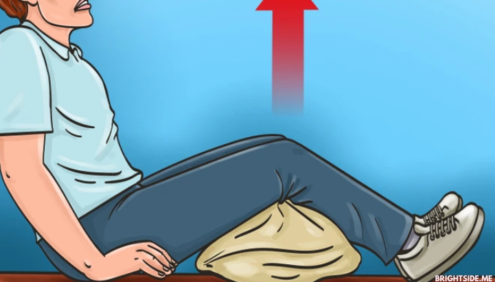 3. Usiądź w bezpiecznej pozycji – zgięte kolana, stopy na podłodze, plecy lekko oparte, kość ogonowa kilka centymetrów od ściany. Nie stój ani nie kładź się płasko.