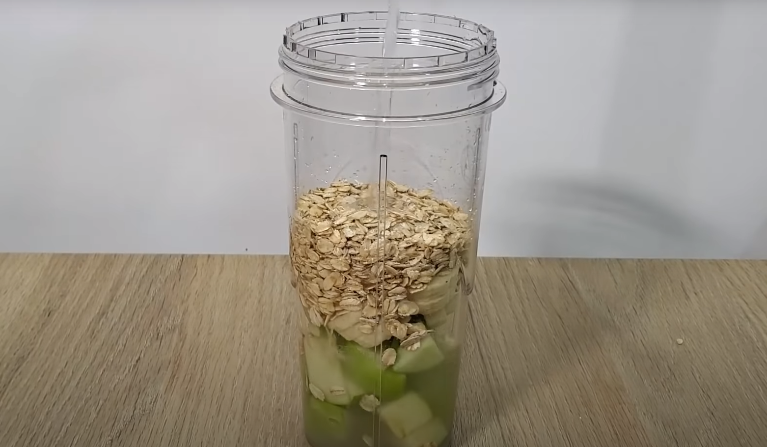 Pokrój banana na plasterki. Umyj jabłko, oczyść je (pozostaw skórkę) i pokrój na mniejsze kawałki . Włóż do blendera, dodaj płatki owsiane i zalej wodą.