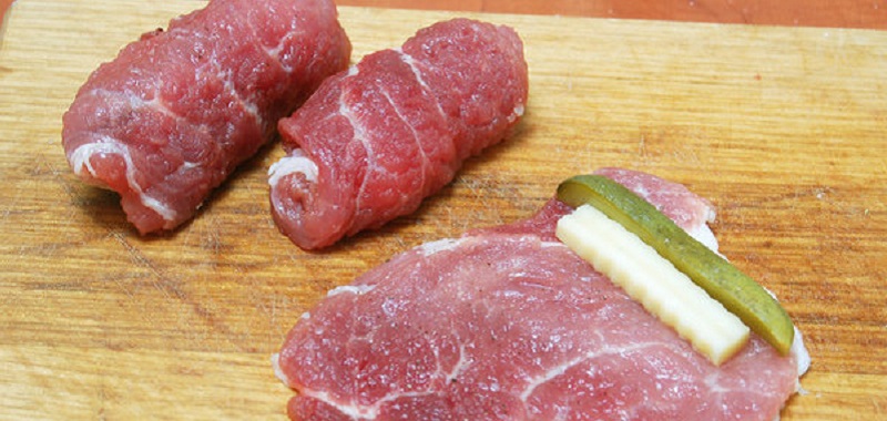 Po upływie wyznaczonego czasu posól mięso. Następnie na każdy rozłożony kawałek ułóż ser oraz ogórka i zwiń całość na kształt rolki. Na koniec zabezpiecz całość przed rozwinięciem, wbijając w końce wykałaczki.