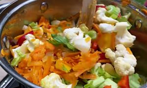 Kalafiora podzielić na różyczki. Seler pokroić w paski wraz z łodygą i dodać wszystko do garnka z pozostałymi warzywami. Napełnij go litrem wody, dodaj łyżeczkę soli, dobrze wymieszaj i pozwól mu się gotować pod pokrywką.
