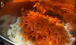 Oczyść i drobno posiekaj cebulę i podsmaż ją w garnku z odrobiną oleju roślinnego. Zetrzyj marchewkę na grubej tarce i dodaj do cebuli, smażonej na różowo.