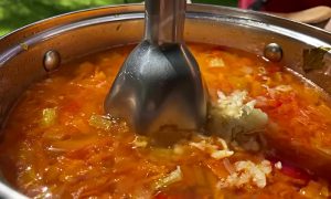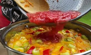 Gdy pomidory i zupa się połączą, dodaj przeciśnięte dwa ząbki czosnku (lub dostosuj ilość do własnych upodobań) i zmiksuj wszystkie warzywa w garnku na gładką masę za pomocą blendera ręcznego.