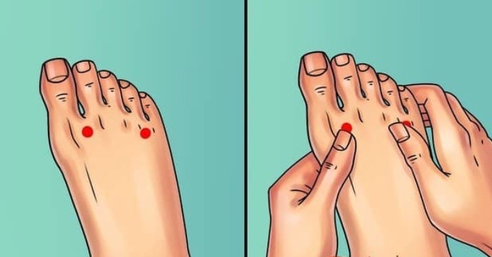 Jeśli bolą Cię stopy po długim dniu, połóż oba palce na punktach znajdujących się na stopach, które widzisz na obrazku (pomiędzy palcami 1 i 2, 4 i 5) i delikatnie masuj je przez 10 do 15 minut. Dzięki temu masażowi rozluźnisz spięty odcinek szyjny kręgosłupa.